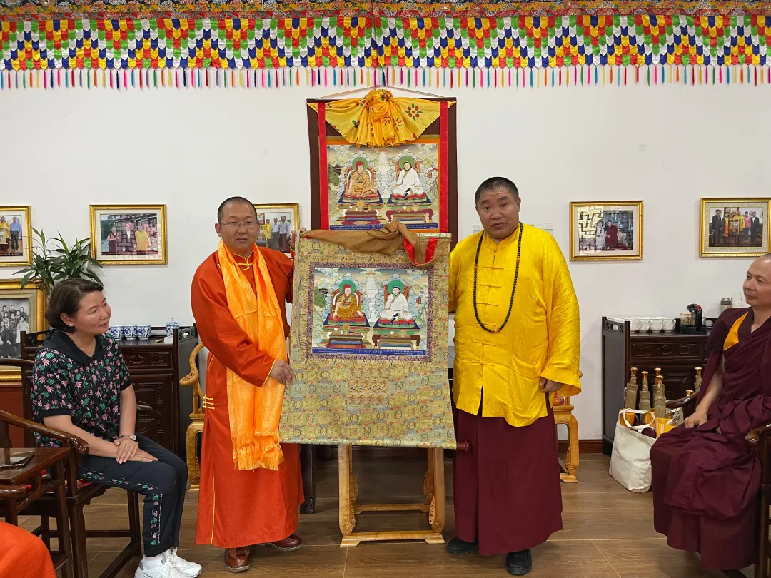 堪布多杰会长向额定巴雅尔会长一行介绍康宁寺主供八思巴忽必烈民族团结纪念唐卡,回顾700年前中华民族共同体场景。