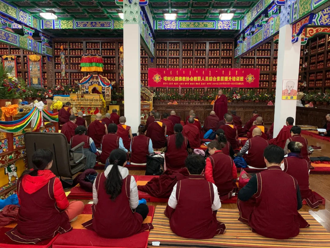 2021年3月13日至3月21日,喀喇沁旗佛教协会教职人员综合素质提升培训班在康宁寺举办。此次培训由喀旗佛协主办,包括喀旗康宁寺、龙泉寺、福会寺,以及兄弟寺院宁城法轮寺、经峰寺,元宝山区静安寺、孤峰寺,敖汉佛祖寺,通辽寿安寺共计9所寺院及居士代表近百名学员参加培训。